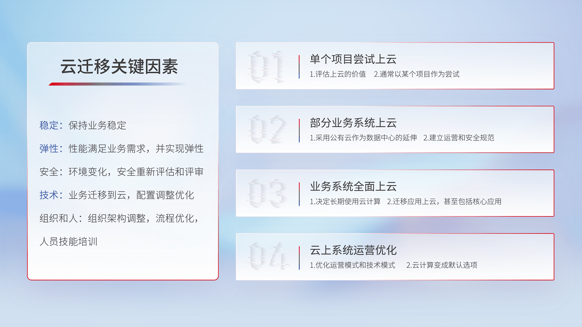 结合实际业务,,,从规划设计、、云平台选型、、、云原生改造、、数据迁移、、、、集成交付,,,迁移全过程为客户识别最佳上云路径,,,做好风险识别管理,,设计网络架构、、身份权限、、安全审计合规、、、、操作审计、、、、日志审计、、、、监控告警策略、、、多站点容灾设计等,,,,对云上基础设施进行整体规划,,,提升IT治理水平,,以满足弹性、、、、高可用、、高性能的需求。。。。